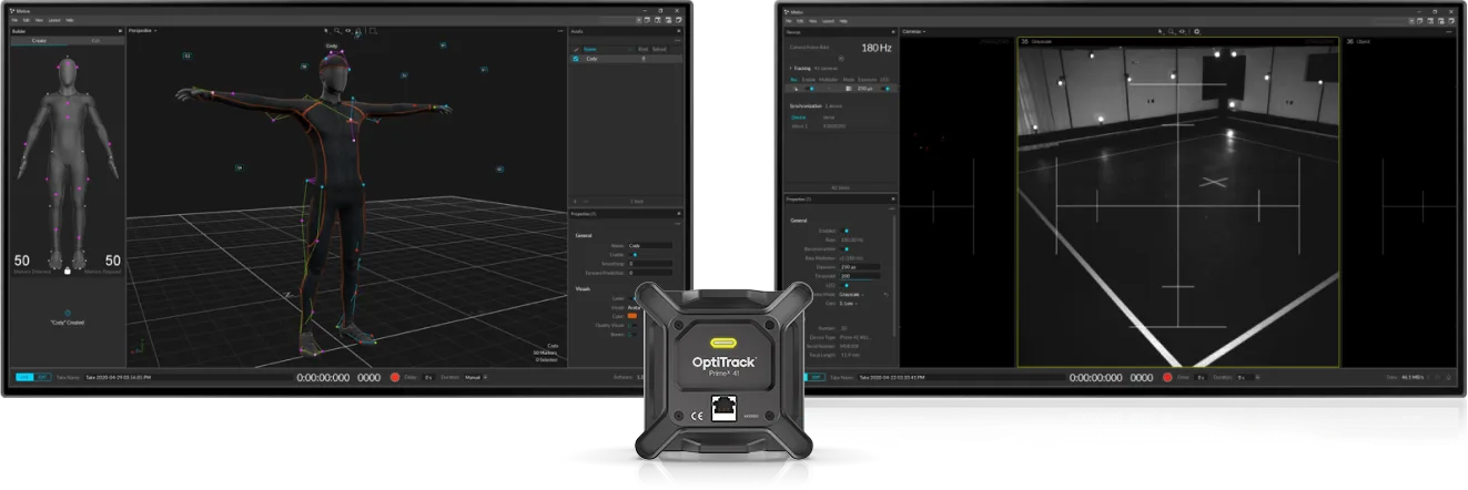 Setup and operation is easy. Motive makes system setup easy. Aim Assist, auto-masking, one-click rigid body creation, versatile hardware and the industry's longest range cameras make even large systems easy to set up with just one person.